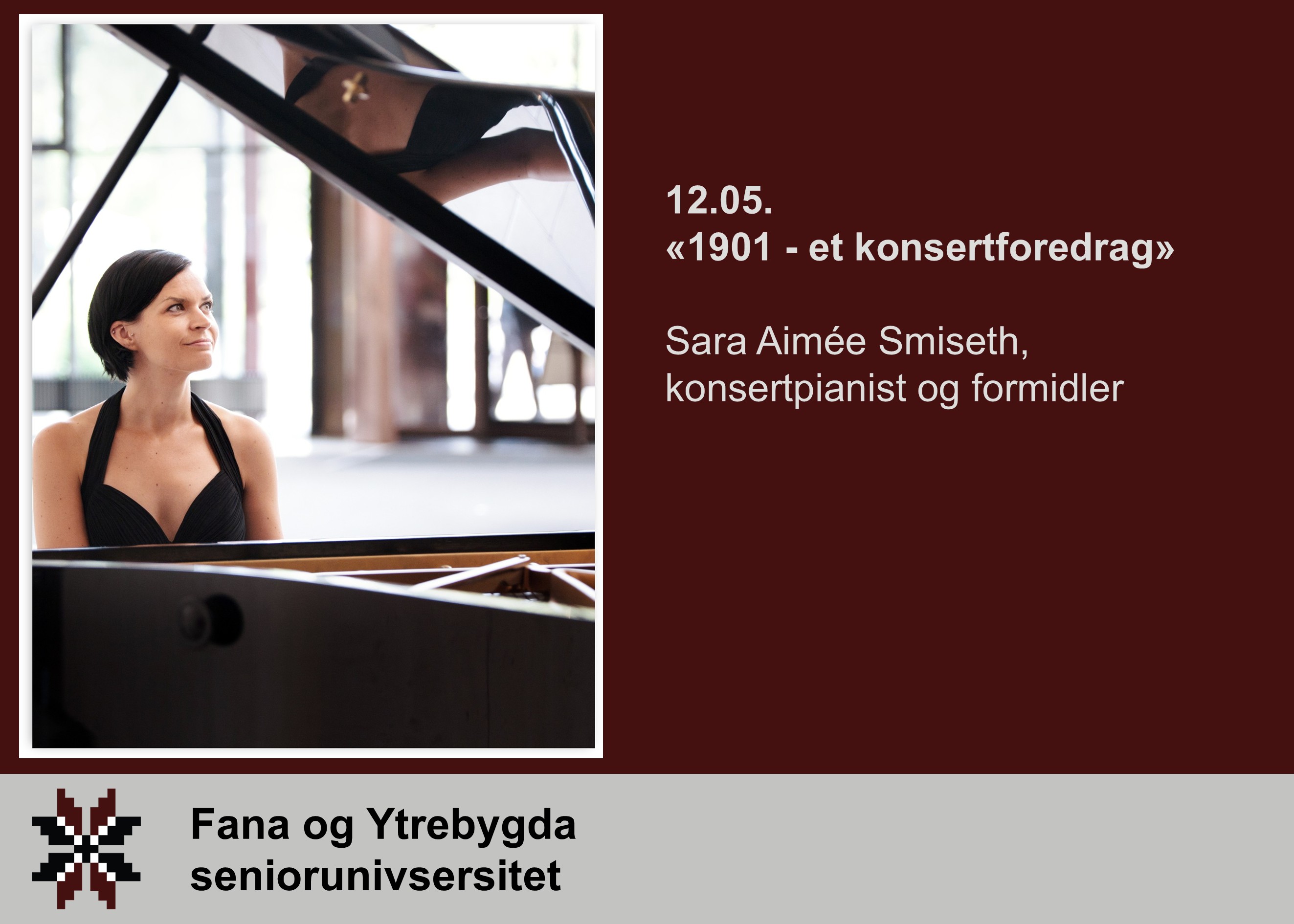 Et konserforedrag av pianist og formidler Sara Aimée Smiseth Hvordan fortoner verden seg for europeere dette året, fiskere i Norge, aristokratiet i England, kunstnere i Paris, befolkningen i de europeiske koloniene? Europa i 1901 er et innblikk i et år i vår historie, rammet inn av pianomusikk komponert innenfor disse tolv månedene i denne helt spesielle brytningstiden. Dette er historien om et år som legger grunnlaget for et helt århundre - og vår egen tid. Tirsdag 12. mai Klokken 11.00-13.00 A